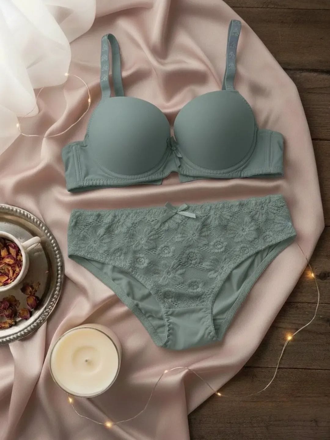 Short Description: Seamless comfort meets floral elegance. This T-shirt style set features a smooth, rounded-cup bra for a perfect fit under thin clothing, paired with high-comfort floral lace briefs in a refreshing mint green.